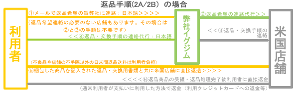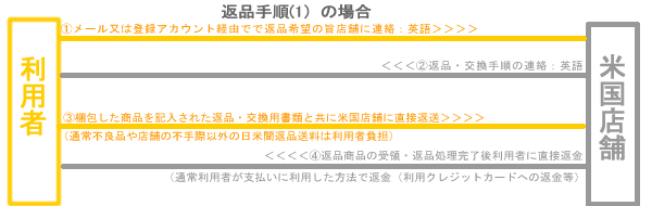 ● アメリカから直接日本へ配送する会社で不良品が送られてきた場合には商品の返送しなくても交換してくれる場合もあるようです。この場合は商品を受け取った時点で店舗に連絡し交換のための手順に従うことになります。交換の場合商品再送のための送料が免除される場合もあるようです。(返品・交換ポリシーは各店舗により異なります。詳細は各店舗ページ、本サイトのオススメショップ日本語概要をご覧ください。))