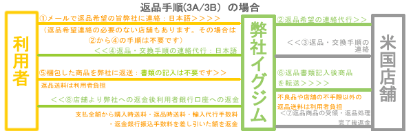 ● 返品時の米国内返品送料は不良品以外の場合は殆どの場合購入者負担になります。(日本への商品転送サービスのみをご利用になった場合は店舗へ直接返品していただくことになります。返金は店舗より直接行われます。弊社への輸入代行サービス手数料の返金はありません。注文・転送サービスをご利用になった場合には一旦弊社宛に返送いただき弊社から返品することになります。この場合弊社から各店舗への米国内配送料も利用者の負担になります。弊社から利用者への返金額はお振込みいただいた金額から商品購入関係費用(商品米国内・日米間配送料金・輸入代行手数料)と返品関係費用(米国内返送料金と返金振込手数料)を差し引いた金額になります。)